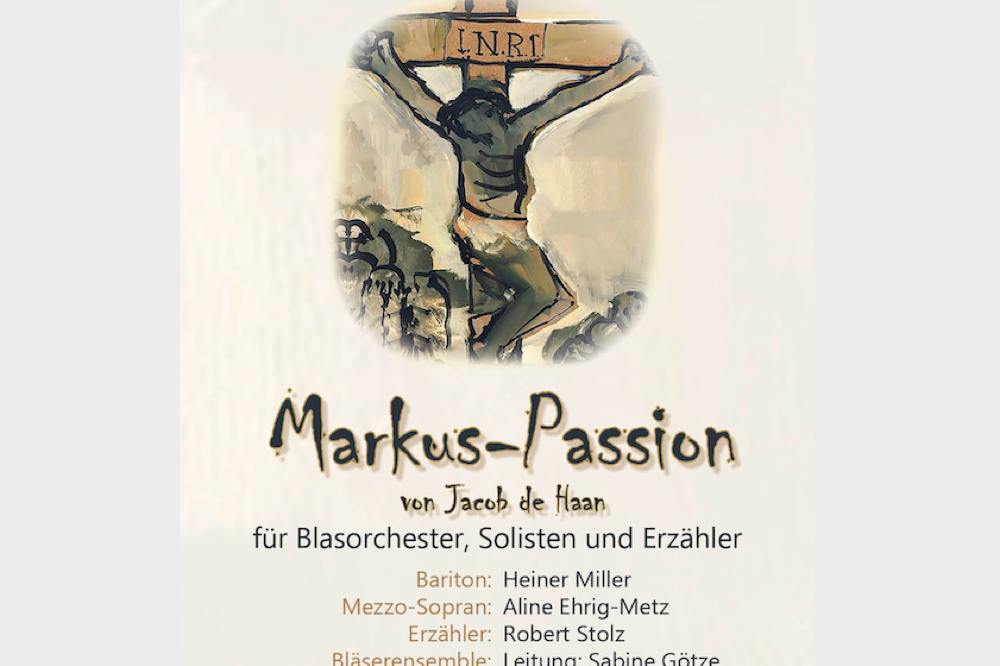 Am Samstag, 02. April um 18.00 Uhr in der Stiftskirche Bad Buchau und am Sonntag, 03. April um 17.00 Uhr in der Dreifaltigkeitskirche in Biberach wird die Markus-Passion von Jacob de Haan für Blasorchester, Gesangssolisten und Erzähler unter der Leitung der Dirigentin unserer Stadtkapelle, Sabine Götze, aufgeführt. Ganz herzliche Einladung. Eintritt frei, um Spenden wird gebeten.