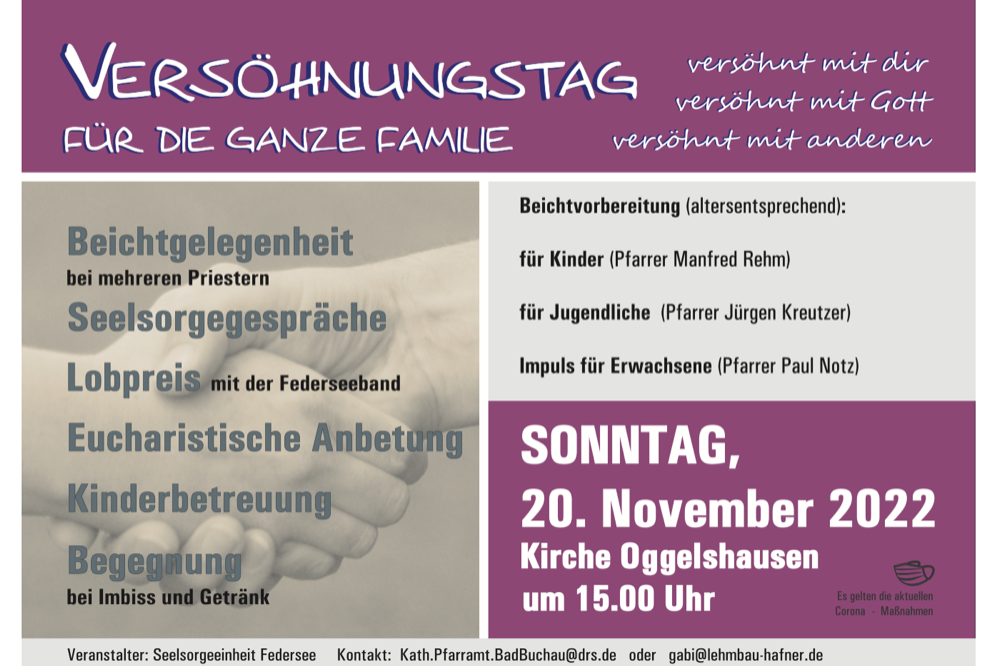 Herzliche Einladung wieder zum Versöhnungstag in Oggelshausen für alle Gemeinden der Seelsorgeeinheit. In gutem Ambiente werden Sie auf die Feier der Versöhnung eingestimmt und genügend Pfarrer werden für Sie da sein, um Beichte zu hören. […] |