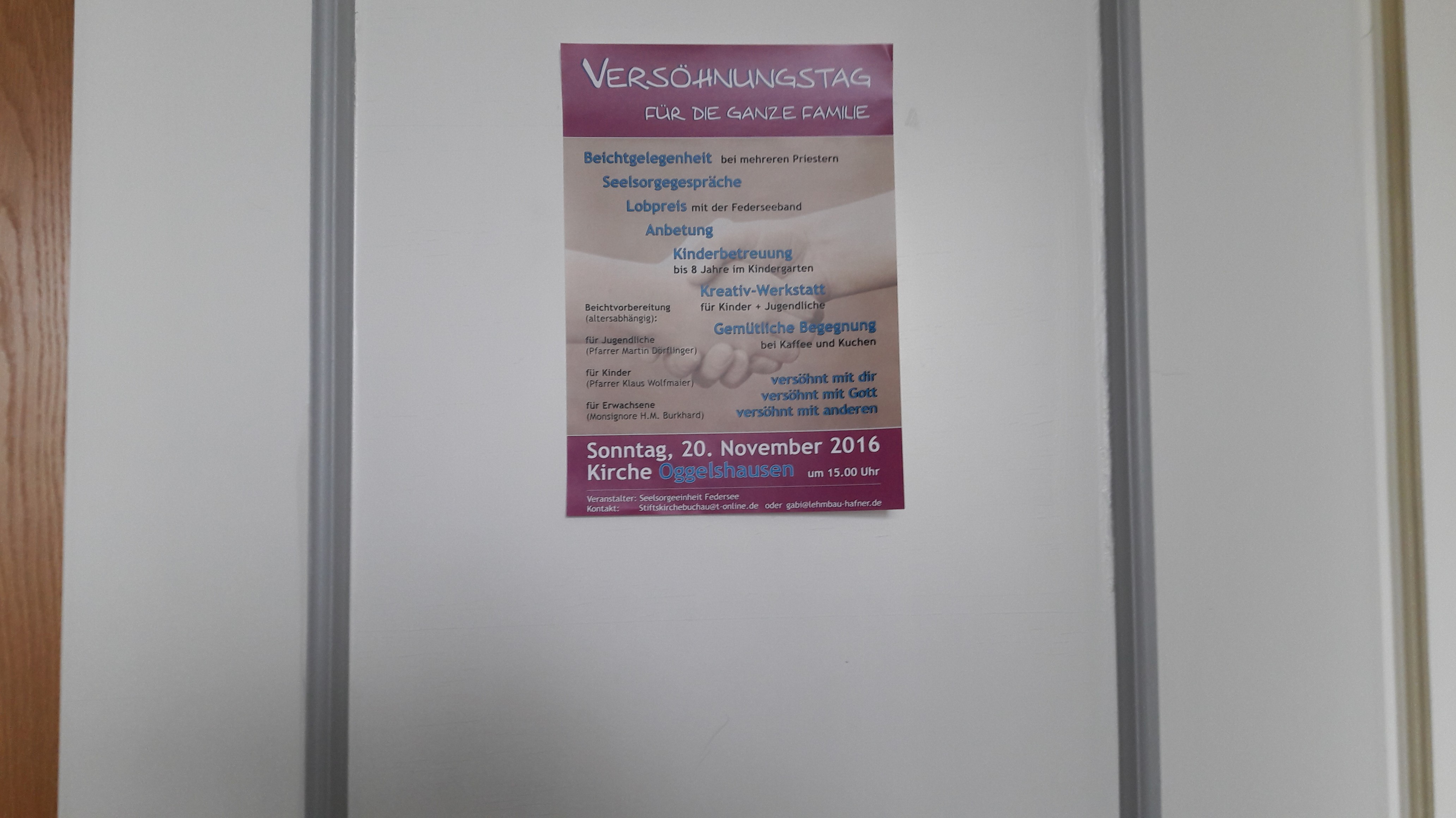 Ganz herzliche Einladung ergeht wieder zu unserem Versöhnungstag. Am Tag des Abschlusses des Jahres der Barmherzigkeit, am Christkönigssonntag, 20. November 2016, findet unser Versöhnungstag zum ersten Mal in Oggelshausen statt. Beginn ist um 15.00 Uhr […] |