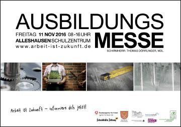 Am Freitag, 11. November 2016 findet im Schulzentrum Alleshausen wieder von 8.00 Uhr bis 16.00 Uhr die Ausbildungsmesse, eine Initiative der KLJB Alleshausen, statt. Schüler aus der gesamten Region können sich über Ausbildungswege und -zweige […] |