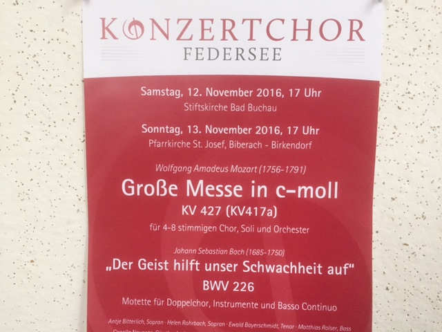Der Konzertchor Federsee führt am Samstag, den 12. November 2016 um 17.00 Uhr in der Stiftskirche die "Große Messe in c-Moll" von Wolfgang Amadeus Mozart und die Motette "Der Geist hilft unser Schwachheit auf" von […] |