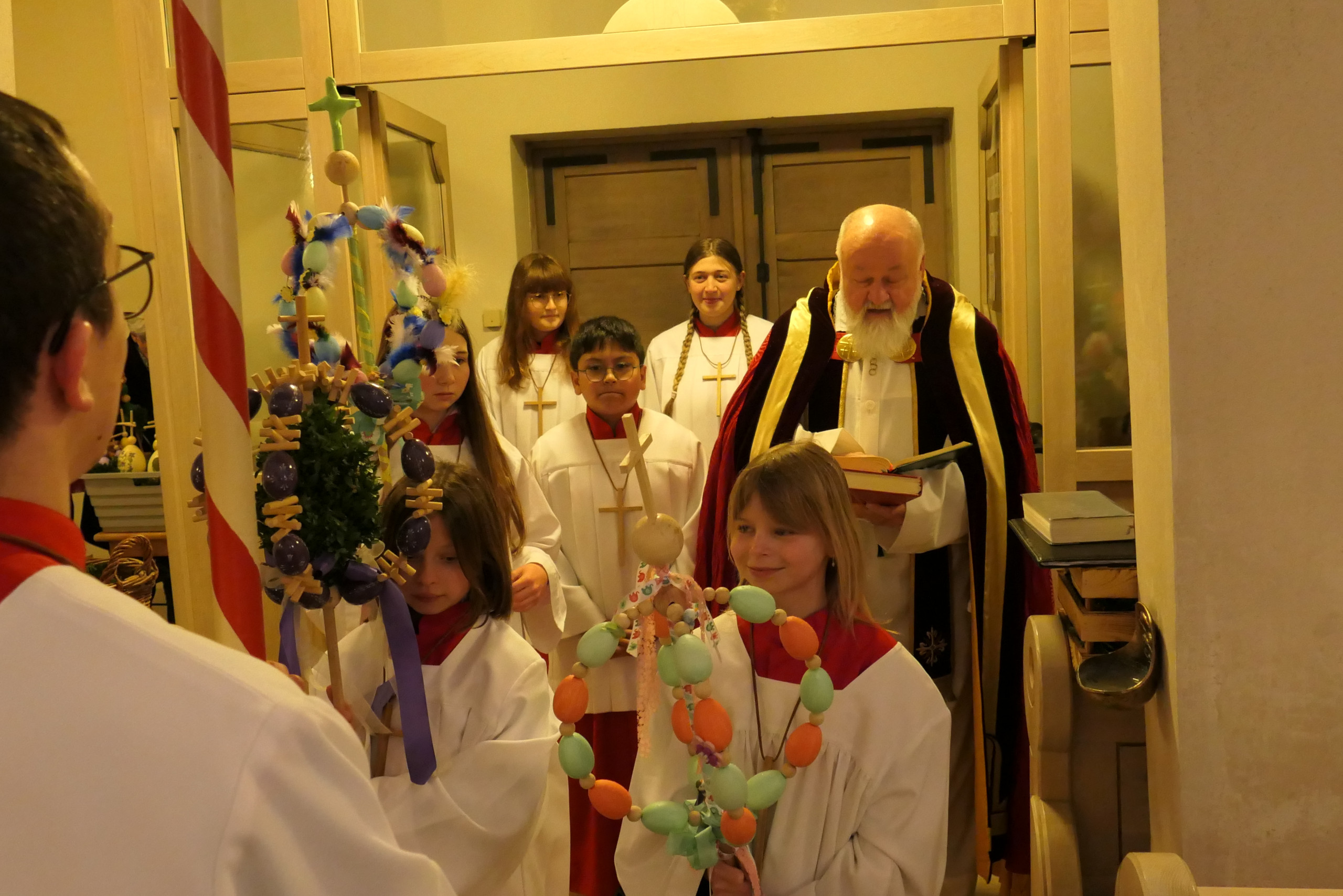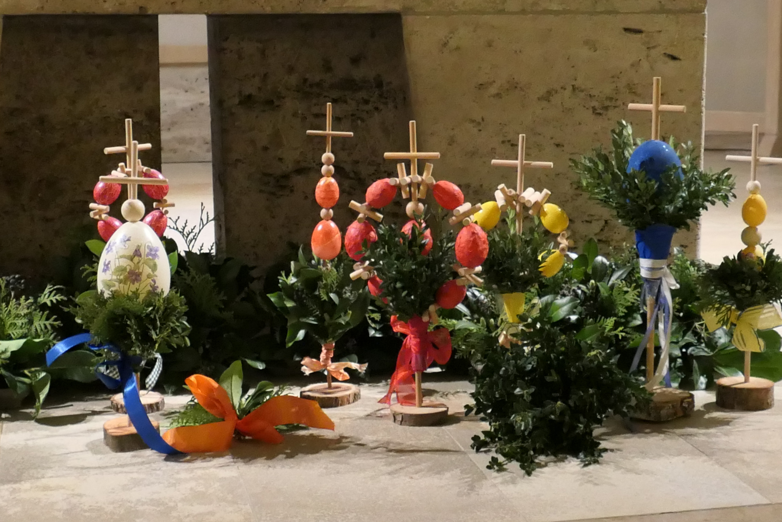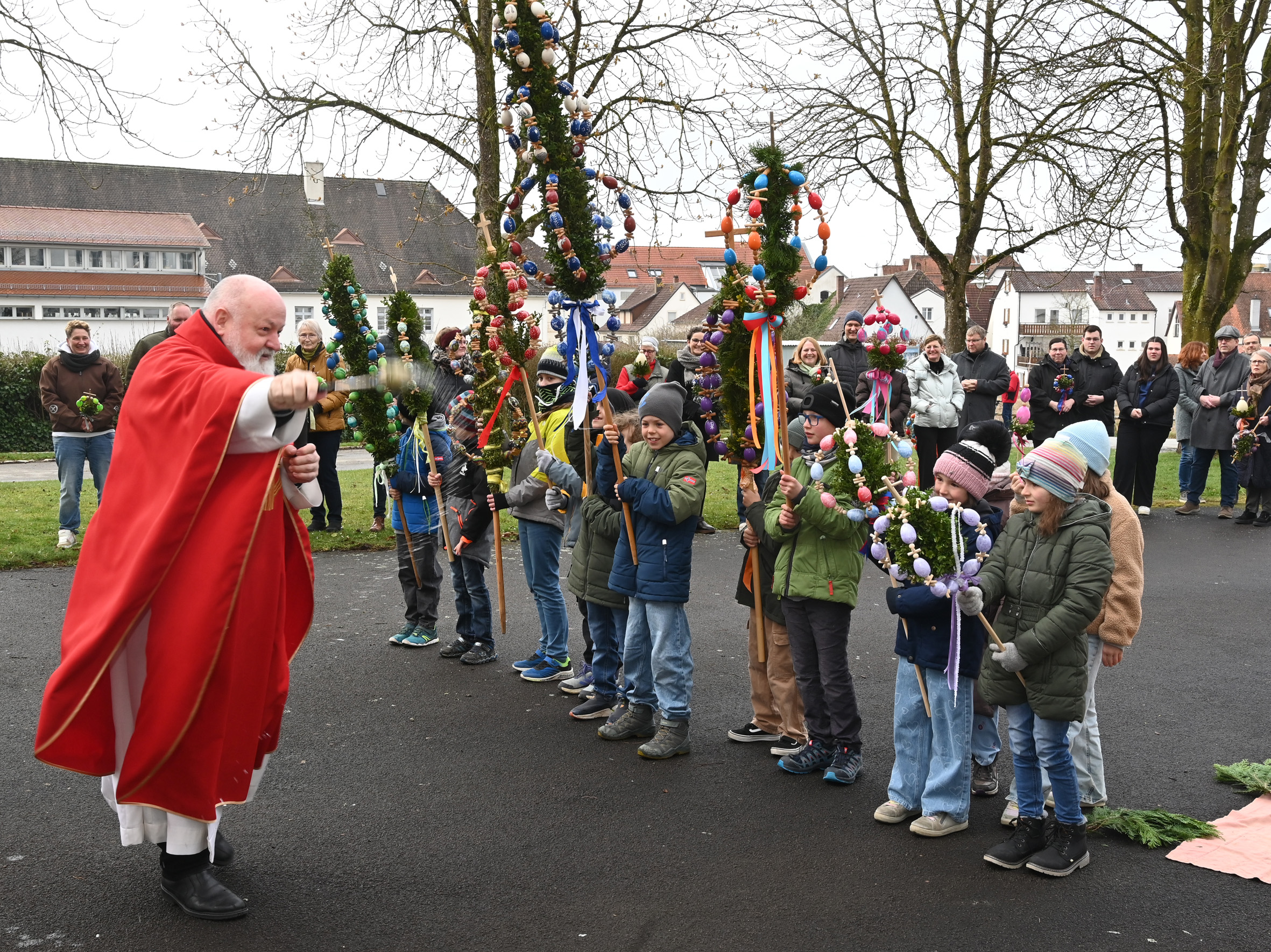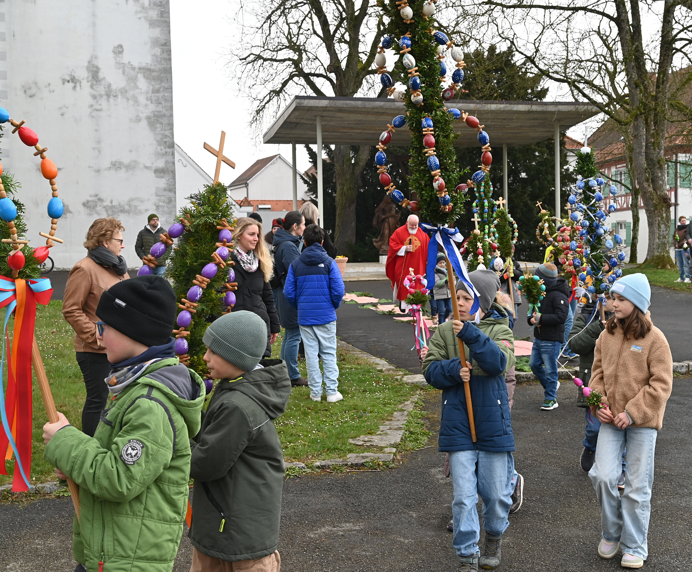 Prächtige Palmen waren nicht nur im Federseegebiet zu Beginn der Karwoche am Palmsonntag zu sehen. In der ganzen Region waren die liebevoll gestalteten Palmen dabei, die vor dem Einzug in die Kirchen, der an Jesu Einzug in Jerusalem erinnern soll, in Bad Buchau von Pfarrer Dörflinger gesegnet wurden. Die vielen Palmträger, die mit dazu beitragen dass der schöne österliche Brauch gepflegt wird, geben dem Palmsonntag immer eine feierliche Note. Prächtige Palmen waren auch in Bad Buchau-Kappel am Samstags-Vorabendgottesdienst , musikalisch von einer Schola des Cyprianuschores begleitet, zu sehen.