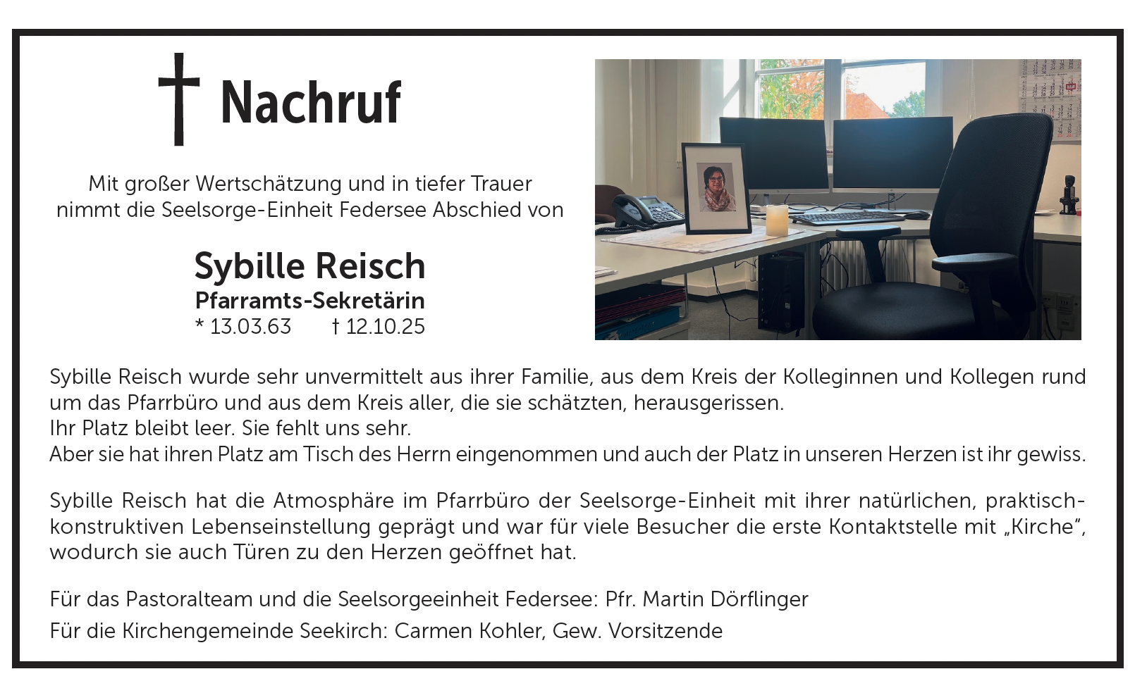Das Pfarrbüro- und Pastoralteam und die Federsee-Gemeinden trauern um unsere Pfarrsekretärin Sybille Reisch und sind in Gedanken mit ihrer Familie und allen, die ihr nahe standen.